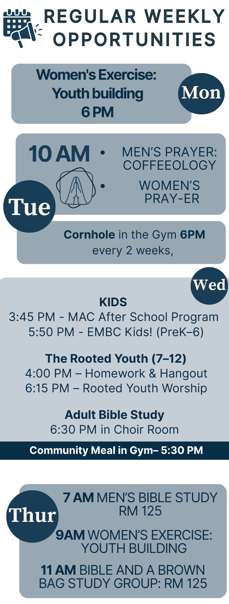 We have a wide range of events throughout the week to help you connect, grow, and serve. From Bible studies to prayer groups, youth programs, and more—there’s something for everyone.